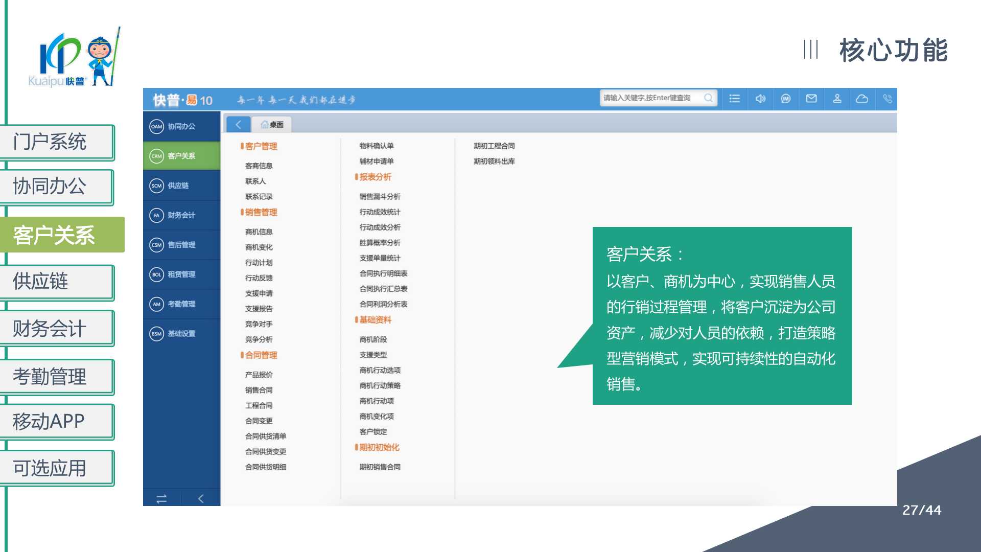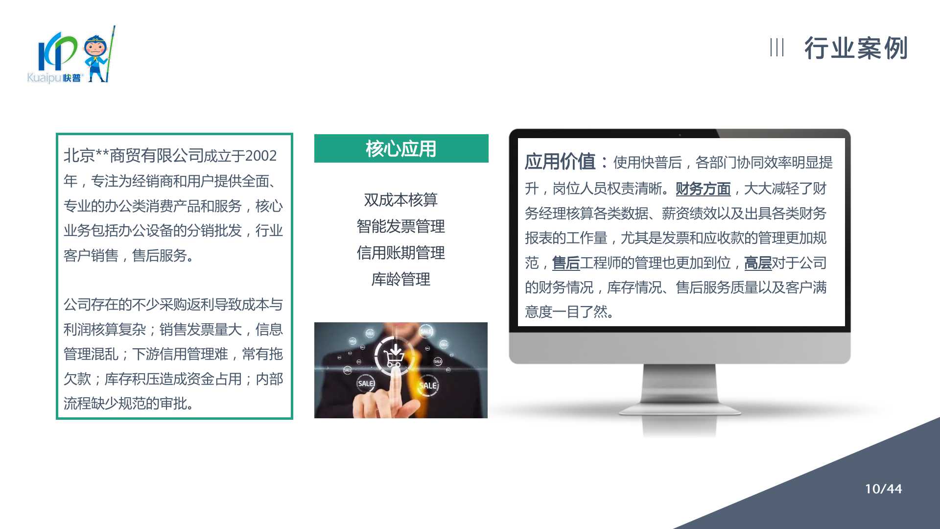 快普易10(商貿(mào)版)提供以客戶為中心的數(shù)字化管理解決方案,涵蓋客戶、銷售、庫存、資金、財(cái)務(wù)等業(yè)財(cái)一體化管理,全面優(yōu)化流程、提高企業(yè)效率,讓每一筆生意明明白白!
