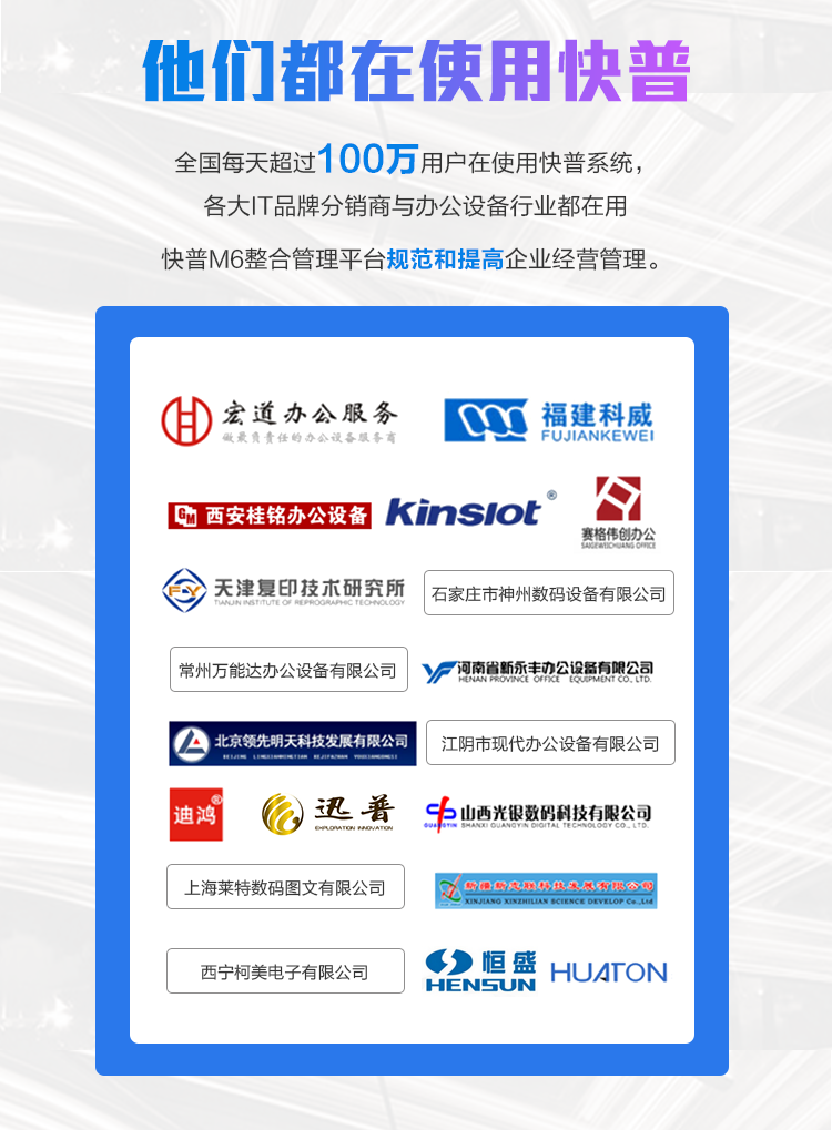 快普M6整合管理平臺(tái)整合了“協(xié)同辦公、客戶關(guān)系管理、供應(yīng)鏈管理、財(cái)務(wù)管理、運(yùn)維服務(wù)管理、租賃抄表管理、生產(chǎn)管理、研發(fā)管理、人力資源管理、電子商務(wù)管理”等業(yè)務(wù)系統(tǒng),同時(shí)實(shí)現(xiàn)與移動(dòng)互聯(lián)應(yīng)用、電話呼叫中心、郵件系統(tǒng)、手機(jī)短信、考勤機(jī)、手持終端等各種硬件設(shè)備無縫銜接。