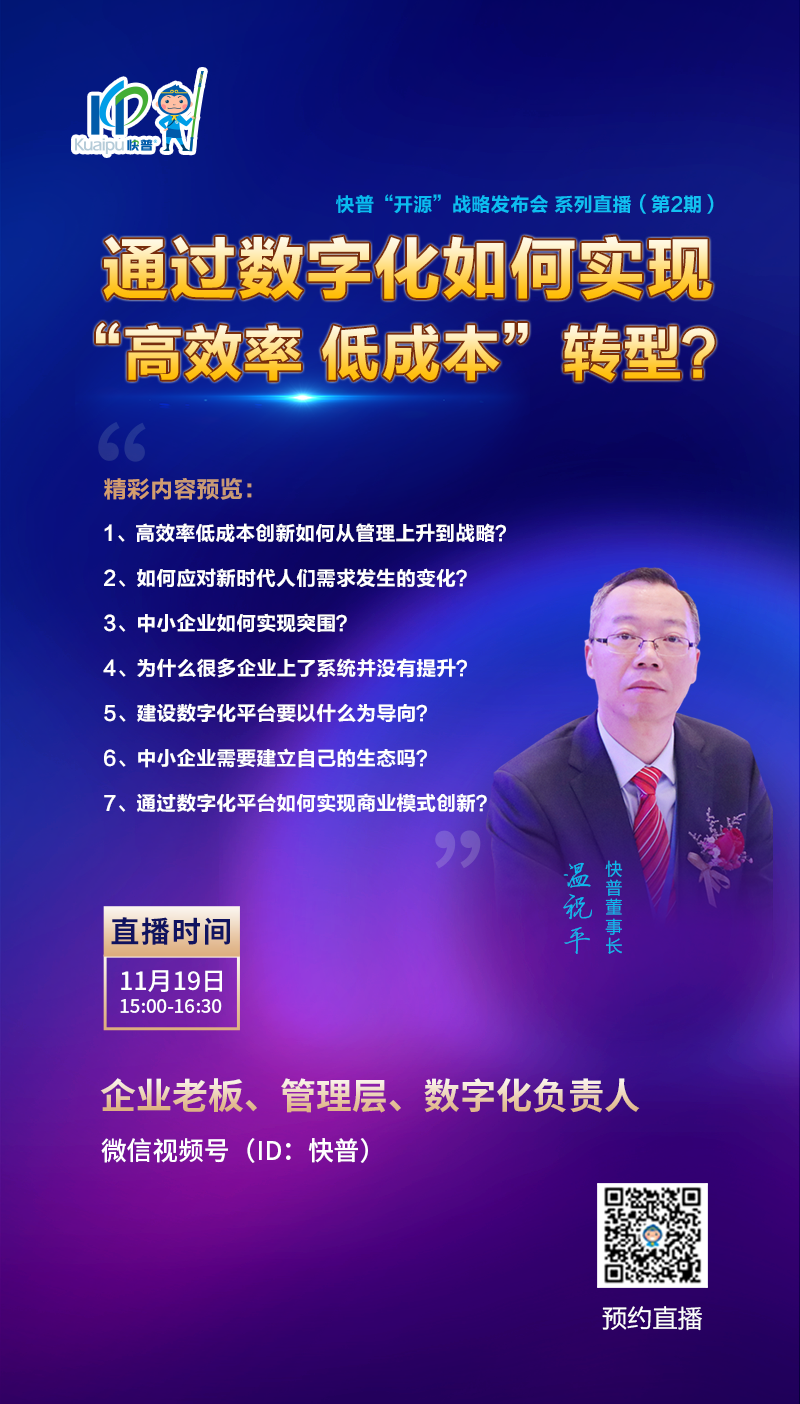 為幫助新老客戶共渡難關,共同面對疫情反復、俄烏戰(zhàn)爭持久化及中美沖突加劇帶來的各種風險和挑戰(zhàn),幫助中國企業(yè)低成本、高效率進行數(shù)字化轉型, 快普已正式啟動ERP“開源”戰(zhàn)略!發(fā)布會(系列)直播從10月起通過“快普”視頻號陸續(xù)播出,與您分享近三年快普最新研發(fā)成果及數(shù)字化轉型解決方案,歡迎新老客戶預約收看,相信能為您的企業(yè)轉型帶來新的啟發(fā)。
