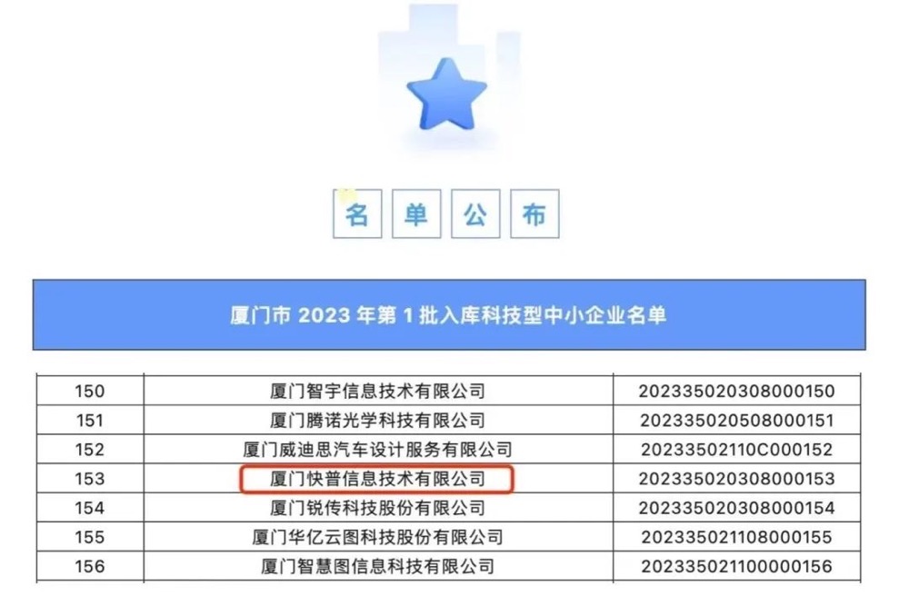 繼“廈門市創(chuàng)新型中小企業(yè)”認(rèn)定后,快普再傳捷報(bào)!近日,廈門市科技局發(fā)布了《2023年第一批入庫科技型中小企業(yè)名單》,快普赫然在列。該項(xiàng)評定意味著快普的技術(shù)成果、科技含量、創(chuàng)新能力等方面獲得了政府相關(guān)部門的充分肯定,同時(shí)也表明快普在科技創(chuàng)新、技術(shù)研發(fā)和知識產(chǎn)權(quán)保護(hù)方面邁上了一個(gè)新的臺階。