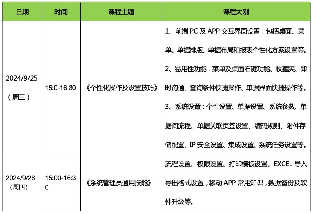 本次培訓(xùn)采取分級(jí)式、系統(tǒng)化的系列培訓(xùn),包括基礎(chǔ)夯實(shí)、中級(jí)進(jìn)階、高級(jí)深化及專題應(yīng)用四大板塊分別進(jìn)行,旨在全方位提升系統(tǒng)管理員及關(guān)鍵崗位人員的專業(yè)技能。從基礎(chǔ)操作到高級(jí)維護(hù),從日常應(yīng)用到深度挖掘。除了精彩的課程內(nèi)容外,我們還為參與培訓(xùn)學(xué)員提供持續(xù)的重點(diǎn)支持,包括匯總問題預(yù)約遠(yuǎn)程會(huì)議一對(duì)一輔導(dǎo),解決疑難雜癥,確保培訓(xùn)成果落地。