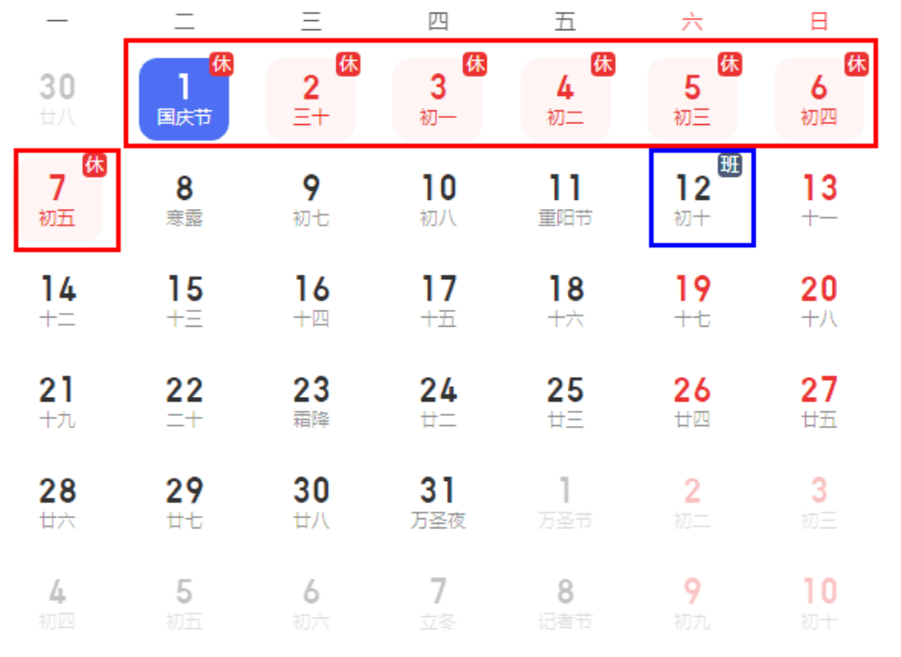 1、放假時間:2024年10月1日(周二)至2024年10月7日(周一)放假,共計7天;