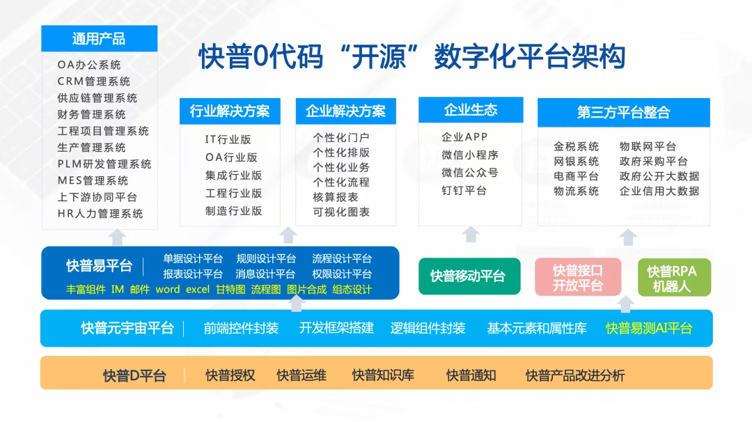 為此,快普依托自主研發(fā)的“快普易”整合管理平臺,以先進的技術(shù)架構(gòu)為企業(yè)提供簡單、靈活的應(yīng)用體驗。平臺具備零代碼配置、多系統(tǒng)無縫整合、AI深度嵌入等核心優(yōu)勢,為企業(yè)提供一條“小快輕準”的數(shù)字化轉(zhuǎn)型路徑: