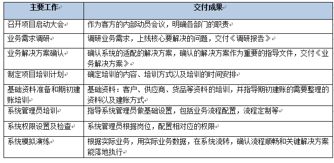 該階段主要是做實施基礎(chǔ)的搭建,包括完成內(nèi)部交接、確認雙方的項目組成員名單、確認實施范圍、確認實施計劃、服務(wù)器準備以及軟件部署。該階段結(jié)束以《項目啟動階段里程碑確認單》作為交付。