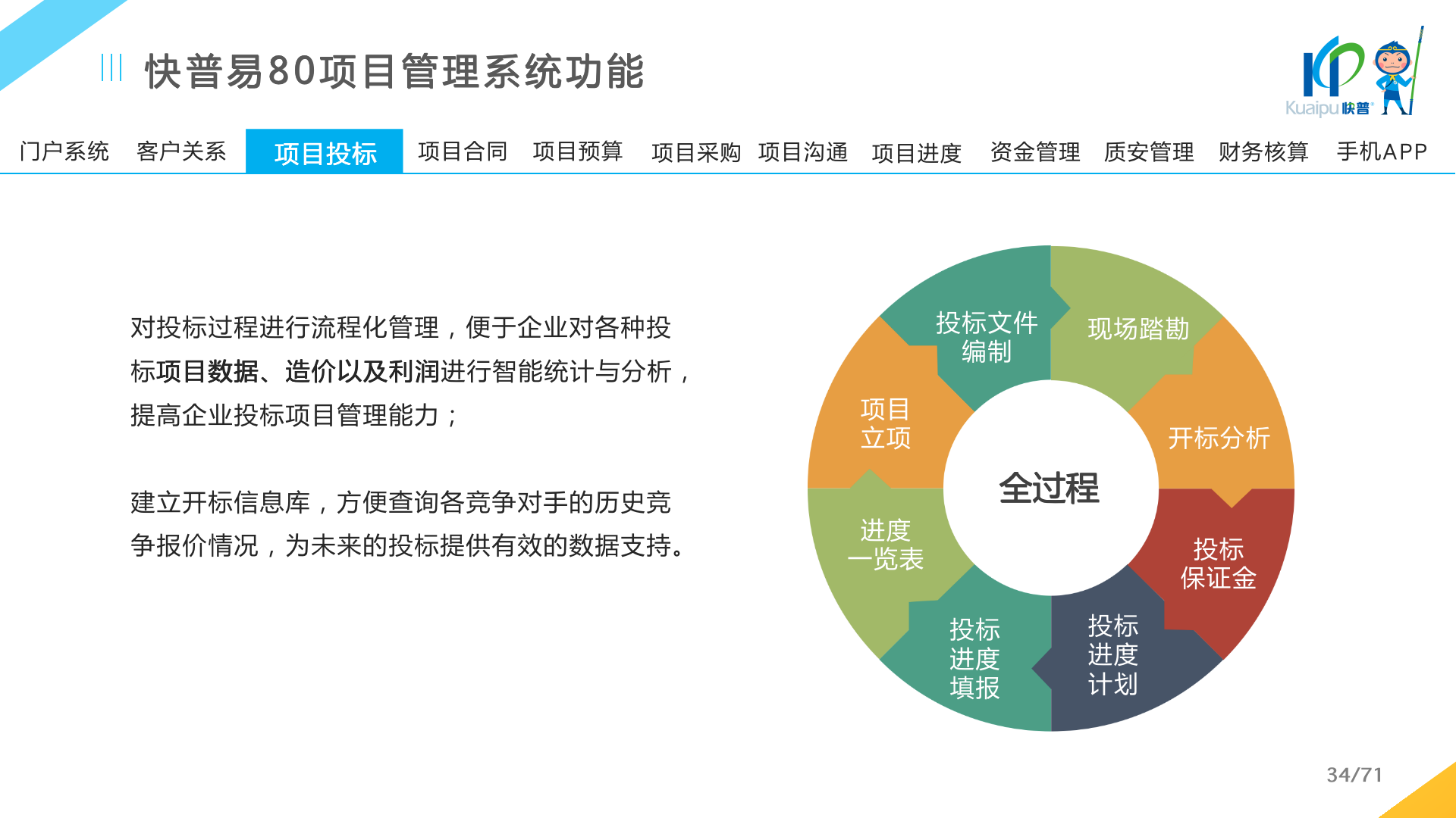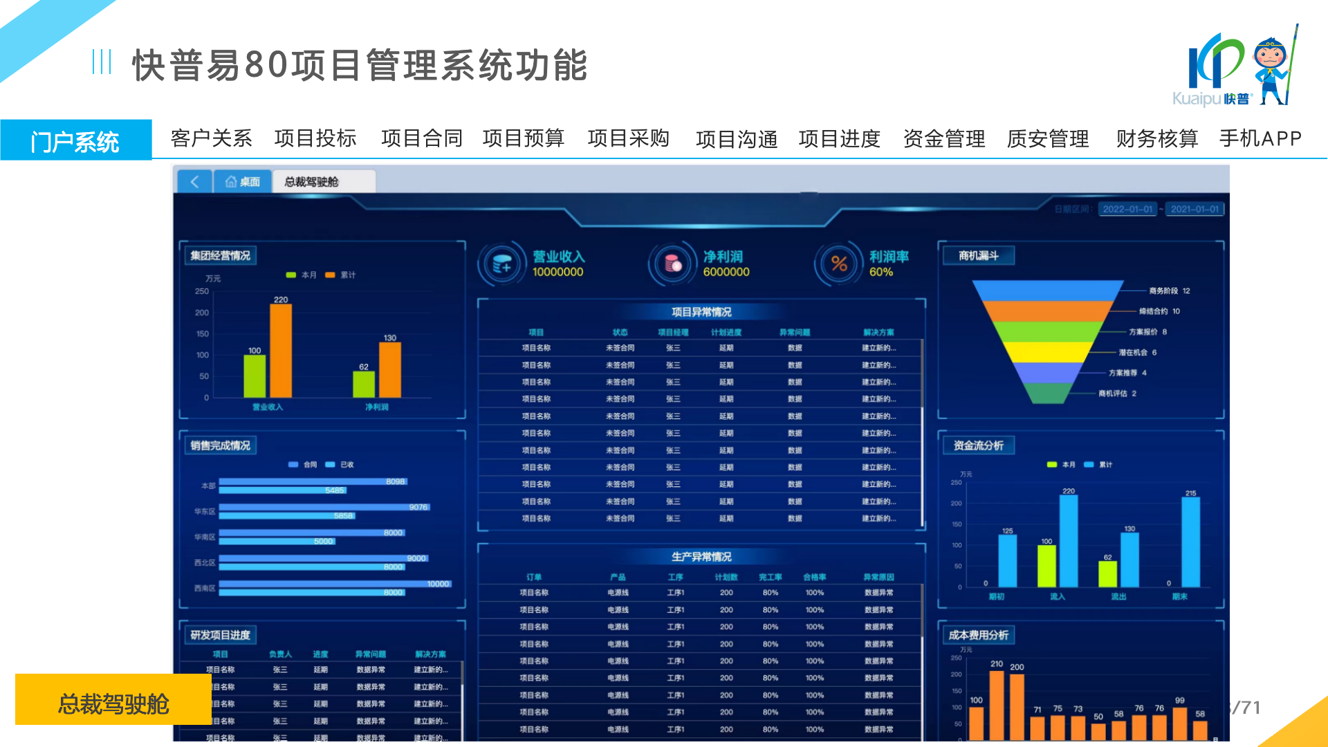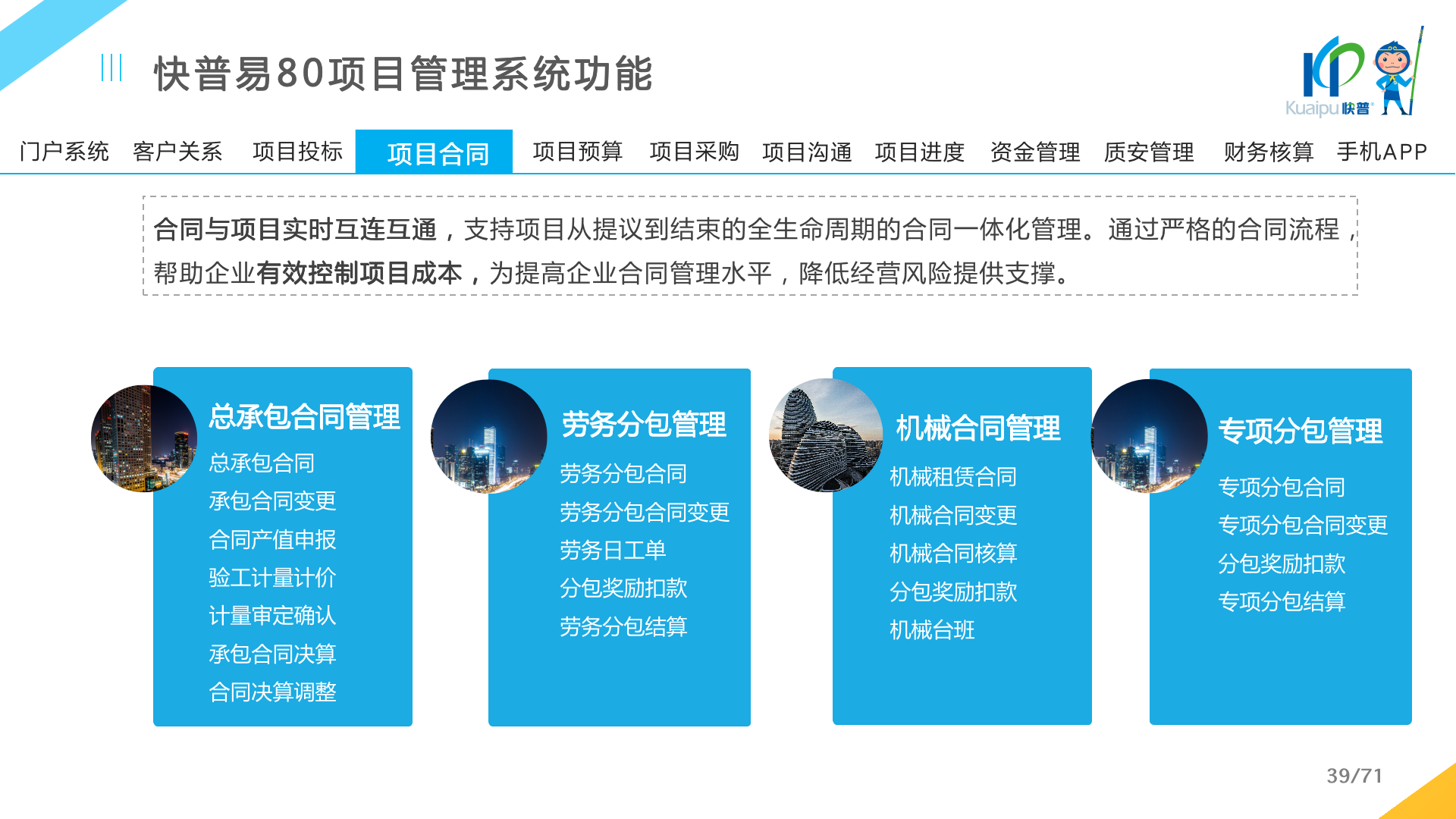 快普易80以項目管理為核心,通過“四控、四管、一協(xié)調(diào)”方式,對項目進度、成本、資金、質(zhì)量安全進行全面控制,實現(xiàn)投標管理、合同管理、物資管理、預(yù)算管理等項目全生命周期項目的數(shù)字化管理,實現(xiàn)資源合理配置、保障良好的項目效益。
